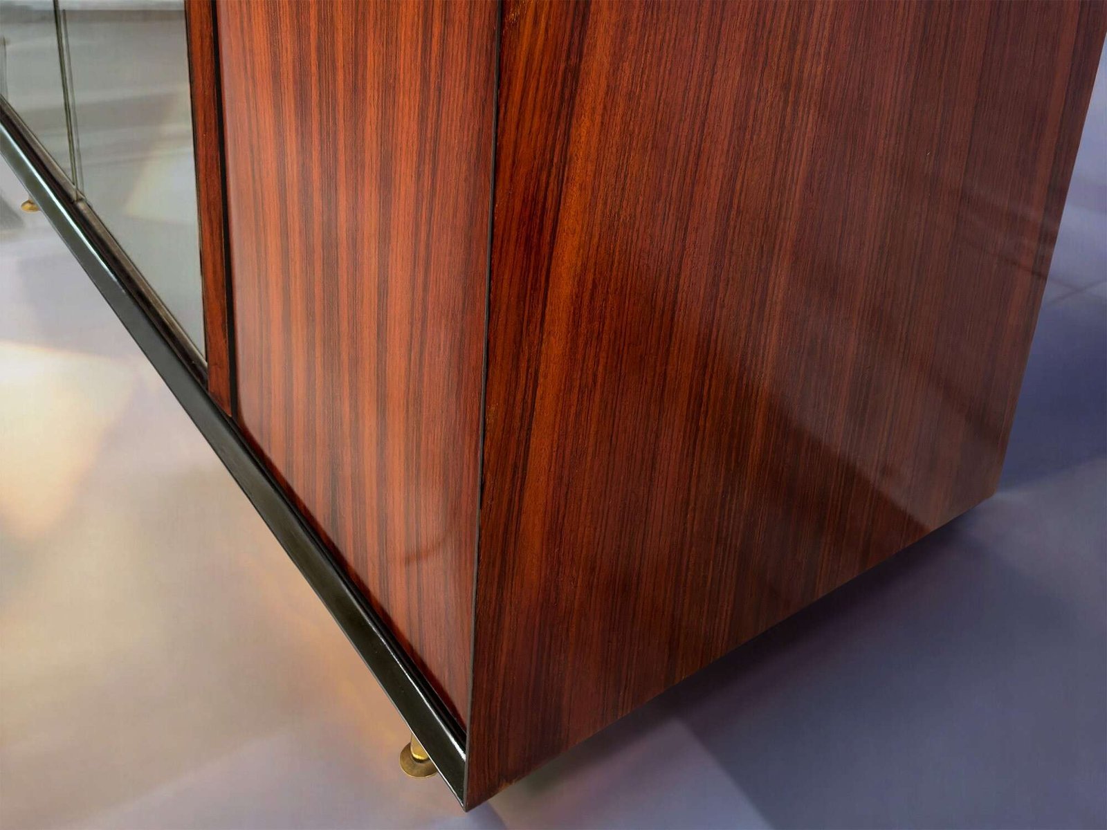 The cabinet is made of a beautiful lacquered teakwood, supported by black metal legs with adjustable brass feet.Â